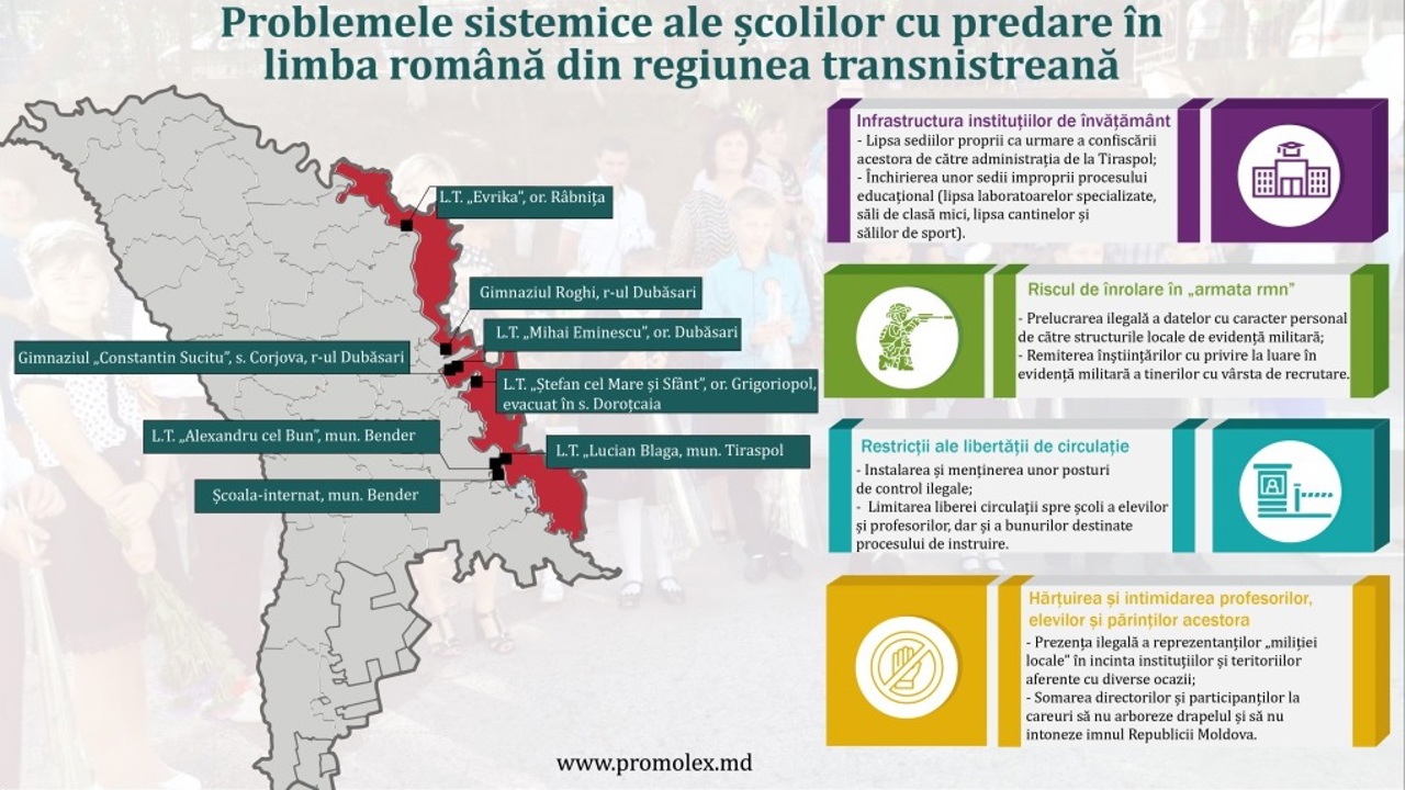 Asociația Promo-LEX solicită autorităților Republicii Moldova să întreprindă acțiuni hotărâte pentru rezolvarea definitivă a dificultăților cu care se confruntă cele 8 instituții de învățământ cu predare în limba română din regiunea transnistreană, se arată într-un comunicat al Asociației.