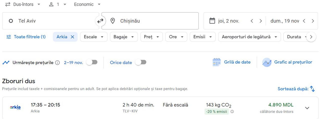 Începând cu 2 noiembrie 2023, vor fi operate zboruri directe Tel Aviv - Chișinău - Tel Aviv. Acestea vor fi operate de către compania israeliana „Arkia”, informează Ministerul Afacerilor Externe și Integrării Europene. „Ambasadorul Republicii Moldova în Israel, Alexandr Roitman, după o întrevedere cu directorul general al companiei aeriene „Arkia”, domnul Gadi Tepper, a anunțat despre lansarea curselor regulate Tel Aviv - Chișinău - Tel Aviv, la prețuri accesibile, începând cu data de 2 noiembrie. Aceste zboruri vor fi operate de două ori pe săptămână, în zilele de joi și duminică”,* se arată în comunicat.