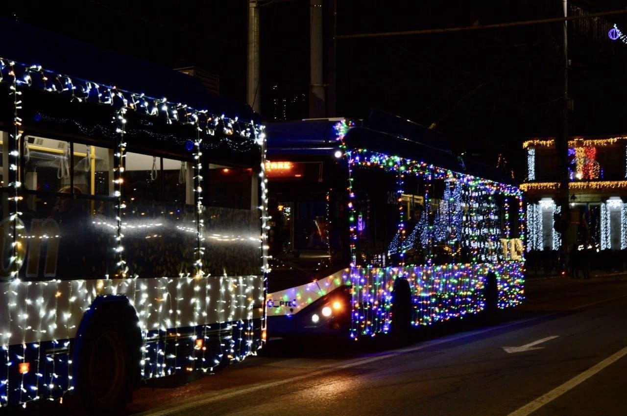 Tot de astăzi și până la sfârșitul lunii ianuarie, aproximativ 30 de troleibuze și patru autobuze din Chișinău vor circula pe străzile capitalei decorate cu luminițe multicolore, în spiritul sărbătorilor de iarnă. Potrivit unui comunicat al primăriei municipiului Chișinău, în acest an numărul unităților de transport împodobit este mai mare decât în anii precedenți, datorită parteneriatului cu mai mulți agenți economici locali, care au contribuit la diversificarea și înnoirea decorurilor festive.
