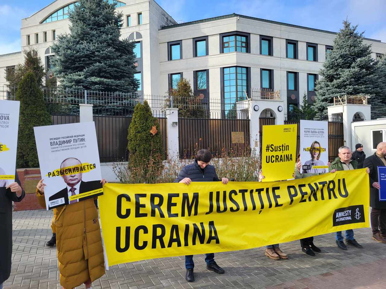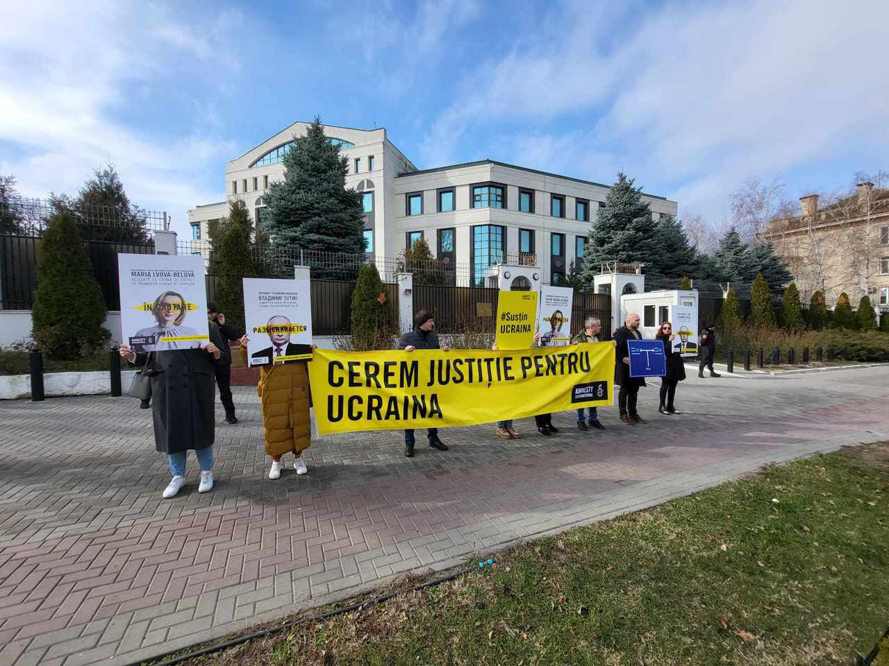Zeci de oameni s-au venit în dimineața zilei în fața sediului Ambasadei Federației Ruse în Republica Moldova pentru a protesta față de politica invadatoare a Rusiei în raport cu Ucraina și alte state. Organizatorii acțiunii civice, Amnesty International, afirmă că au documentat numeroase atrocități comise de Rusia în ultimii 10 ani în Ucraina.