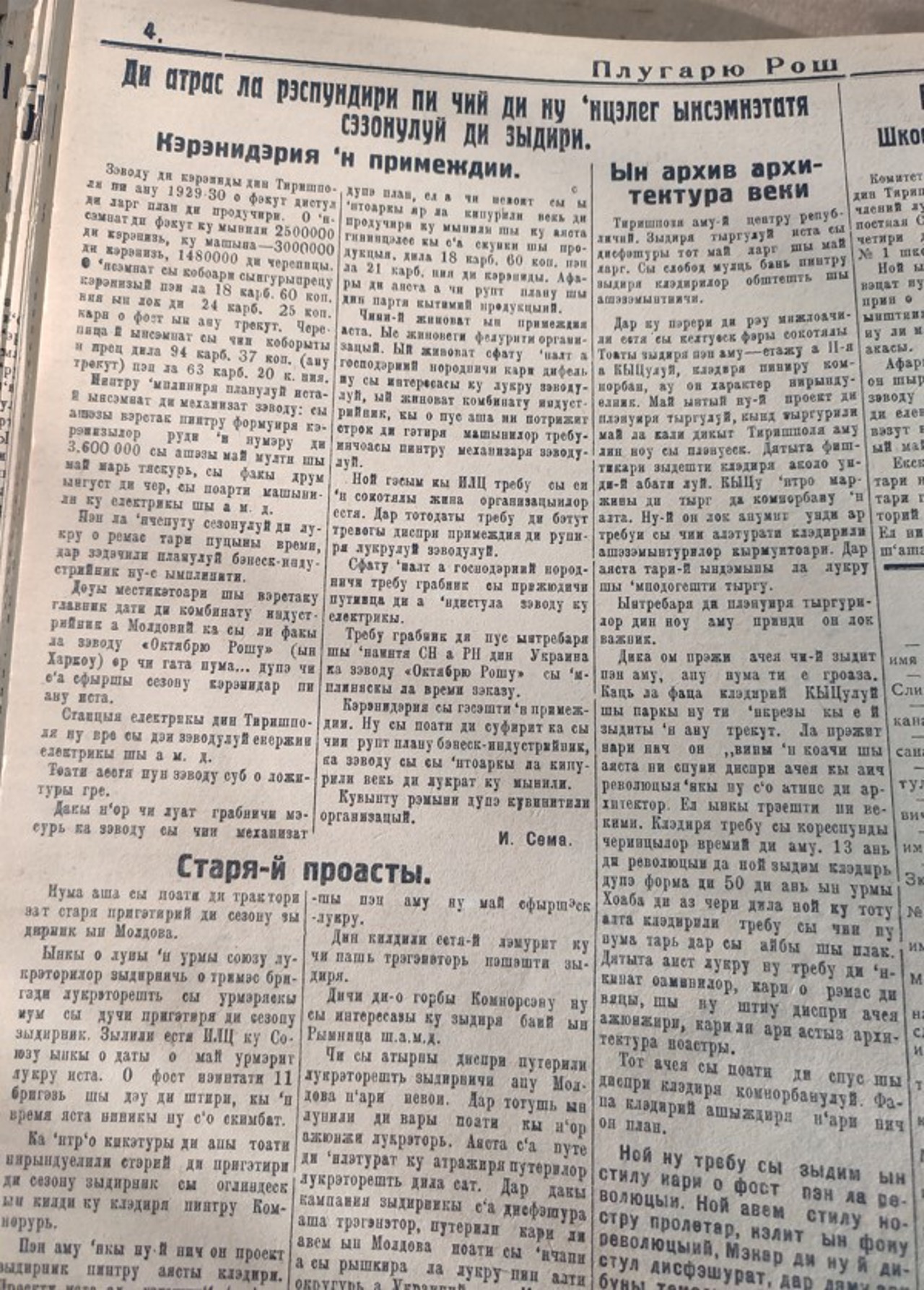 Și în stânga Nistrului, în așa-numita RASSM, lucrurile nu par să evolueze în conformitate cu așteptările. Publicația bisăptămânală de partid „Plugarul Roșu”, sau „Plugariu Roș”, conform denumirii moldovenizate, a dedicat în ediția din 16 martie 1930 o pagină problemelor din sectorul construcțiilor, îndemnând să fi trași la răspundere „cei di nu nțeleg însămnătatea săzonului di zîdiri”.