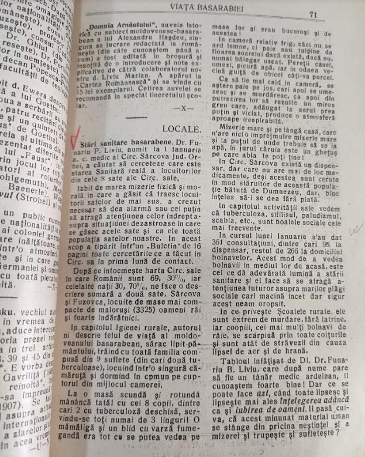 Autorul menționa că aceste condiții favorizau apariția diverselor maladii. Cele mai răspândite la acea vreme erau tuberculoza, paludizmul și scabia. Și școlile rurale se aflau într-o stare sanitară deplorabilă, extrem de murdare, fără „latrine”, cu majoritatea copiilor bolnavi de scabie/râie.