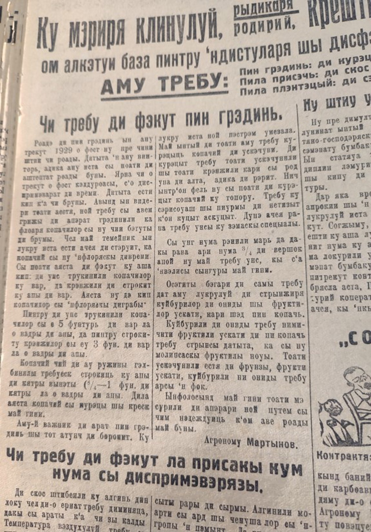 „Starea-i proastî. Numa așa sî poati di tractorizat (interpretat n.red) starea pregătirii di sezonu zîdirnic în Moldova”, potrivit unui alt articol. Acesta menționa că în pofida suplimentării numărului de muncitori situația nu s-a schimbat: „O fost naintăti 11 brigăzi și dău di știri cî-n vremea iasta ninicî nu s-o schimbat”.