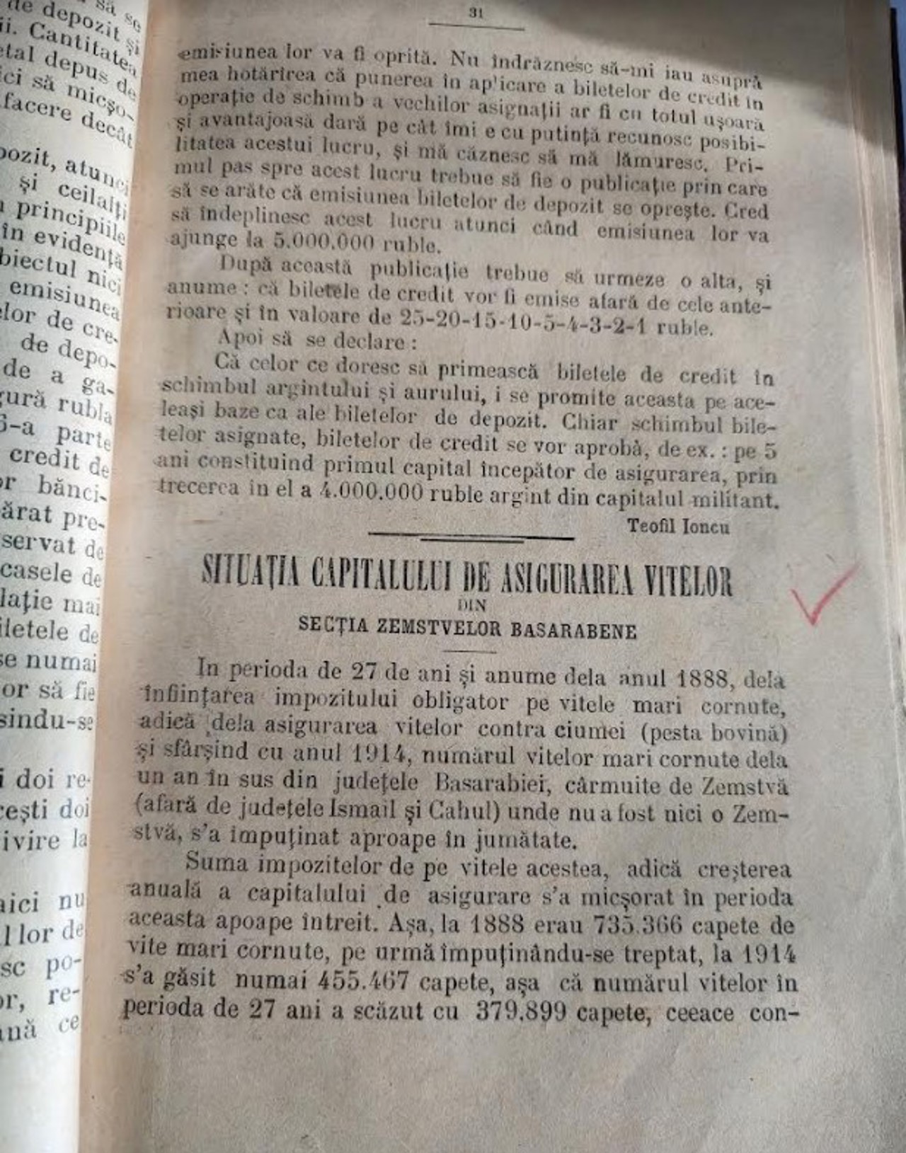 În martie 1919 ziarul Basarabia Economică era preocupat de scăderea de la an la an a numărului de vite mari cornute. Publicația menționa că de la introducerea impozitului obligatoriu pentru asigurarea contra ciumei a acestei categorii de animale, din 1888 și către anul 1914, numărul de vite s-a redus în jumătate. Prin urmare și suma impozitelor s-a micșorat de trei ori.