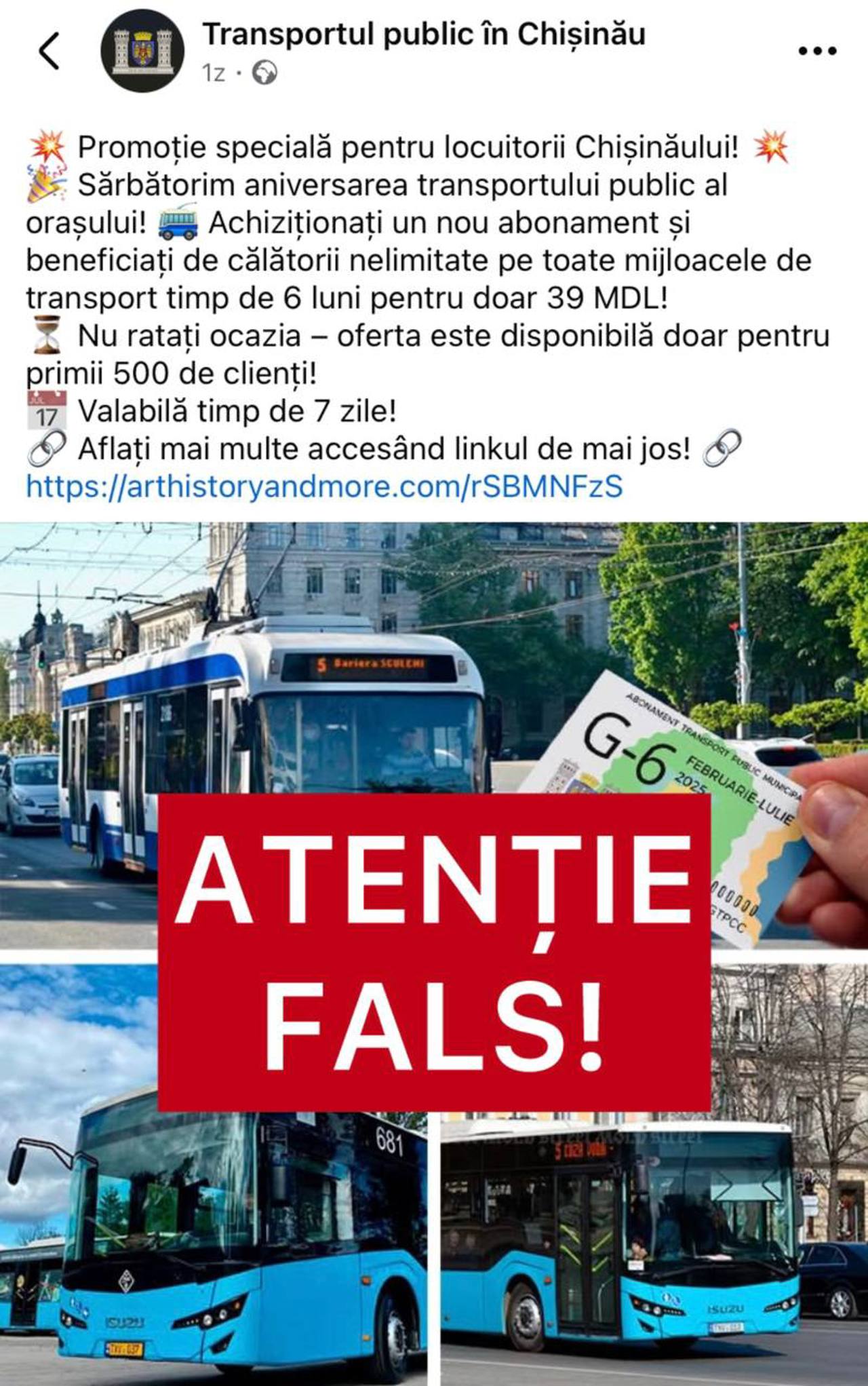 „Regia Transport Electric Chișinău” (RTEC) avertizează că în mediul online circulă o ofertă falsă privind abonamentele pentru transportul public din capitală. Potrivit unei postări distribuite pe rețelele sociale, ar fi disponibil un abonament pentru șase luni la prețul de doar 39 de lei. Instituția precizează că această informație nu este veridică și nu provine din surse oficiale.