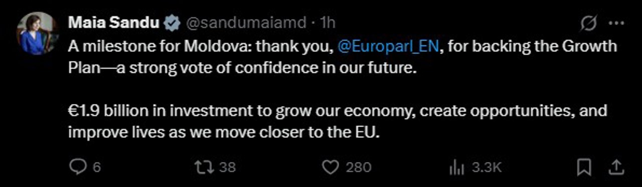 A milestone for Moldova: we thank the European Parliament for supporting the Growth Plan- a strong vote of confidence in our future. €1.9 billion in investments to grow our economy, create opportunities and improve people’s lives as we move closer to the EU.