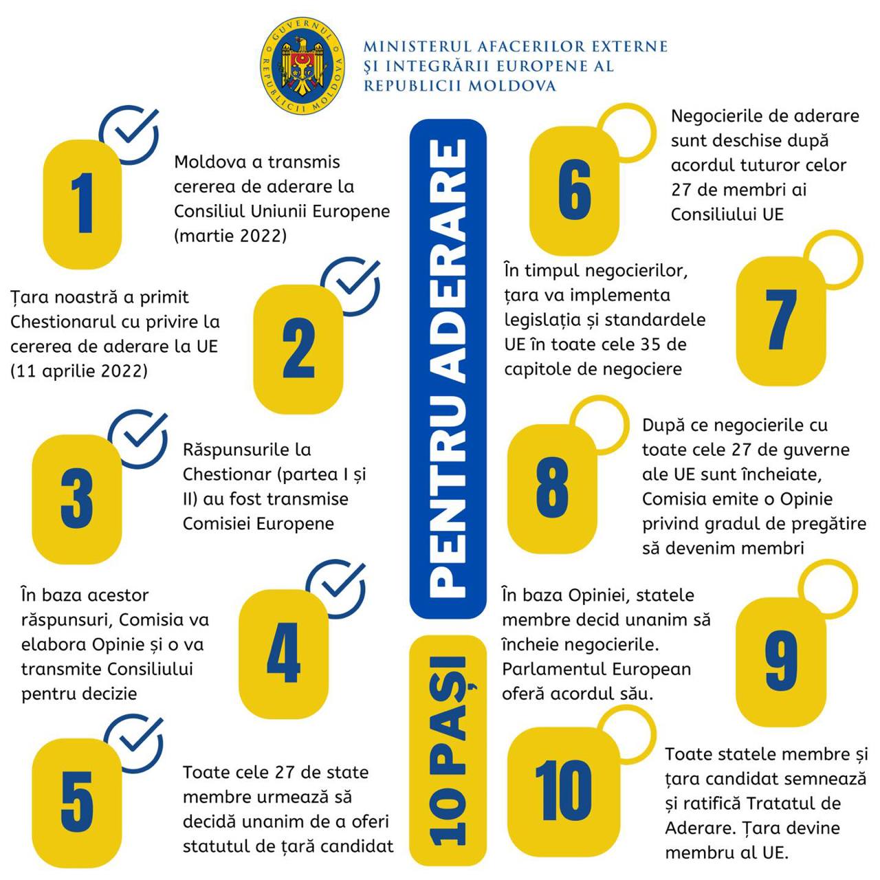 În prezent, Republica Moldova este una din nouă țări cu statut de candidat pentru aderarea la UE. După avizul pozitiv al Consiliului European din decembrie 2023 se pregătește pentru deschiderea negocierilor de aderare. În martie anul trecut, Comisia Europeană a făcut publice reformele și revizuirea politicilor înainte de extindere. Astfel, statele candidate vor putea beneficia de anumite avantaje similare cu cele ale statelor membre UE în unele sectoare, chiar înainte de aderare. Negocierile de aderare au fost deschise oficial în iunie 2024. Ulterior, Comisia Europeană a anunțat că Ucraina și Republica Moldova au îndeplinit condițiile pentru a lansa negocierile de aderare la UE