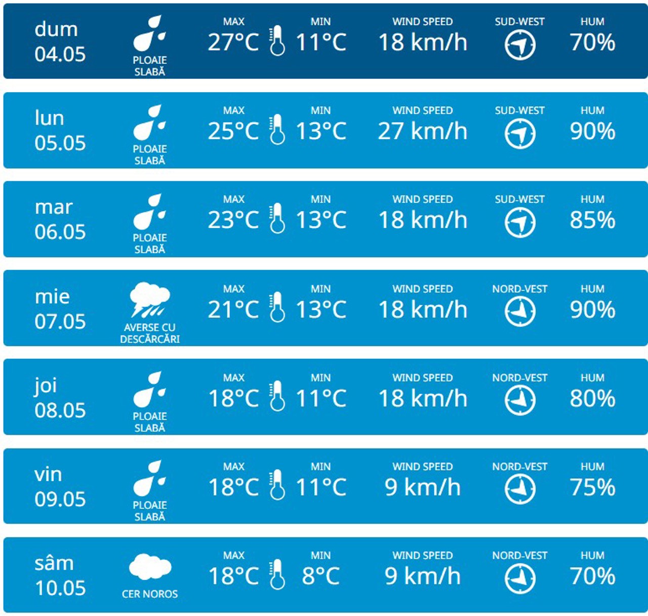 Pe timp de zi, termometrele vor înregistra temperaturi între 21-29 de grade Celsius, iar noaptea vor fi între 8-15 grade. De miercuri însă, vremea se răcește brusc cu aproximativ 10 grade Celsius. Astfel, ziua vom avea între 15 și 20 de grade, iar noaptea - între 10 și 15 grade.