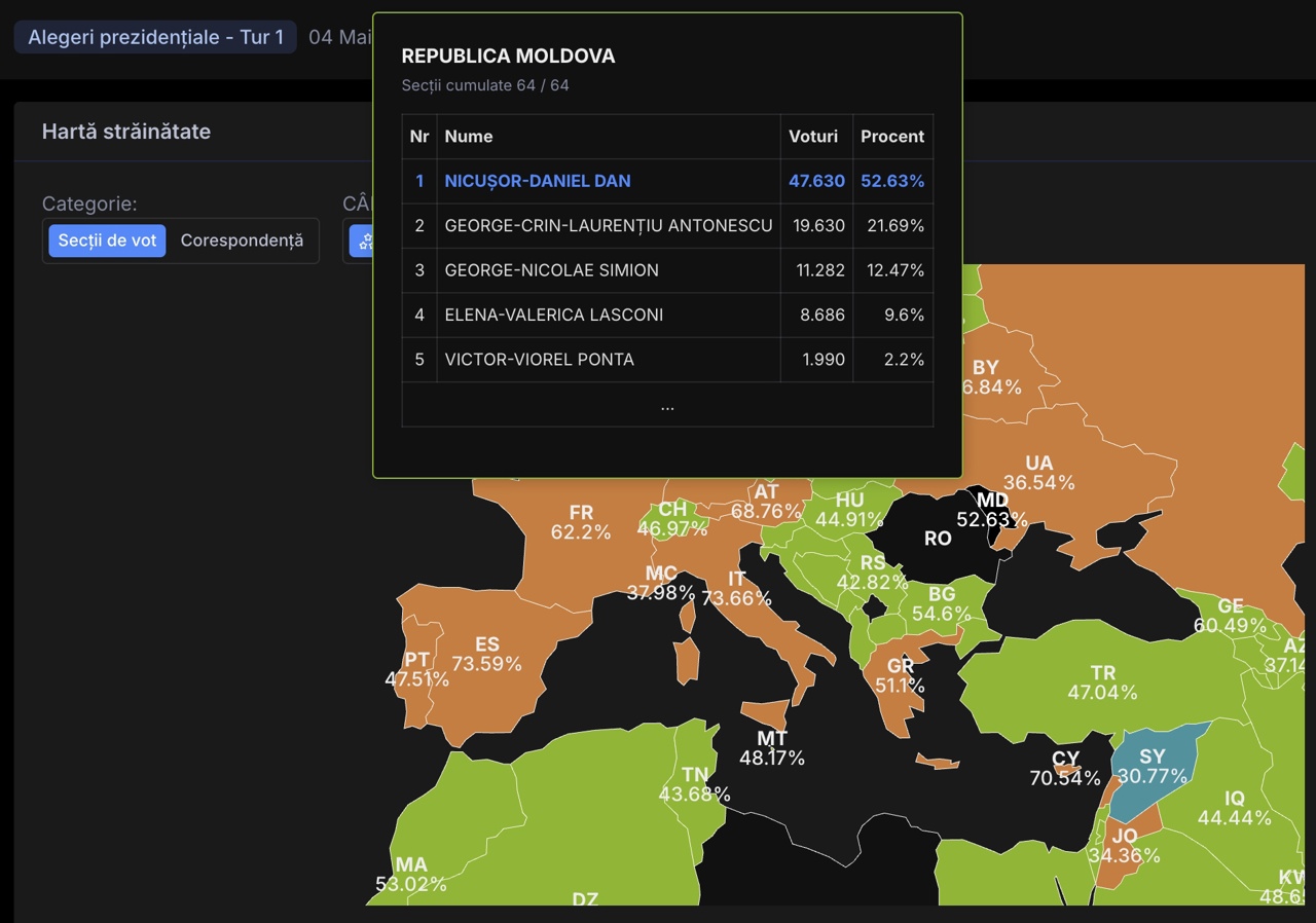 Candidatul independent și primarul general al Bucureștiului, Nicușor Dan, s-a clasat pe primul loc în Republica Moldova la primul tur al alegerilor prezidențiale din România, obținând 52,63% din voturi, potrivit rezultatelor finale publicate de Autoritatea Electorală Permanentă. În total, la cele 64 de secții deschise au votat 90.851 de persoane.