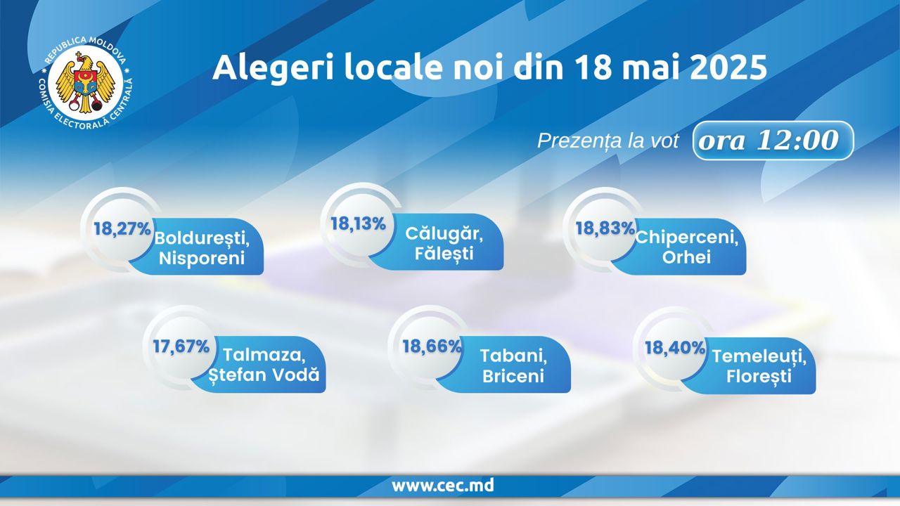 Până la ora 12:00, 3 052 de alegători și-au exercitat dreptul la vot în cele șase localități din Republica Moldova unde astăzi au loc alegeri locale noi. Potrivit Comisiei Electorale Centrale, această cifră reprezintă 18,19% din numărul total al alegătorilor înscriși pe listele electorale de bază.