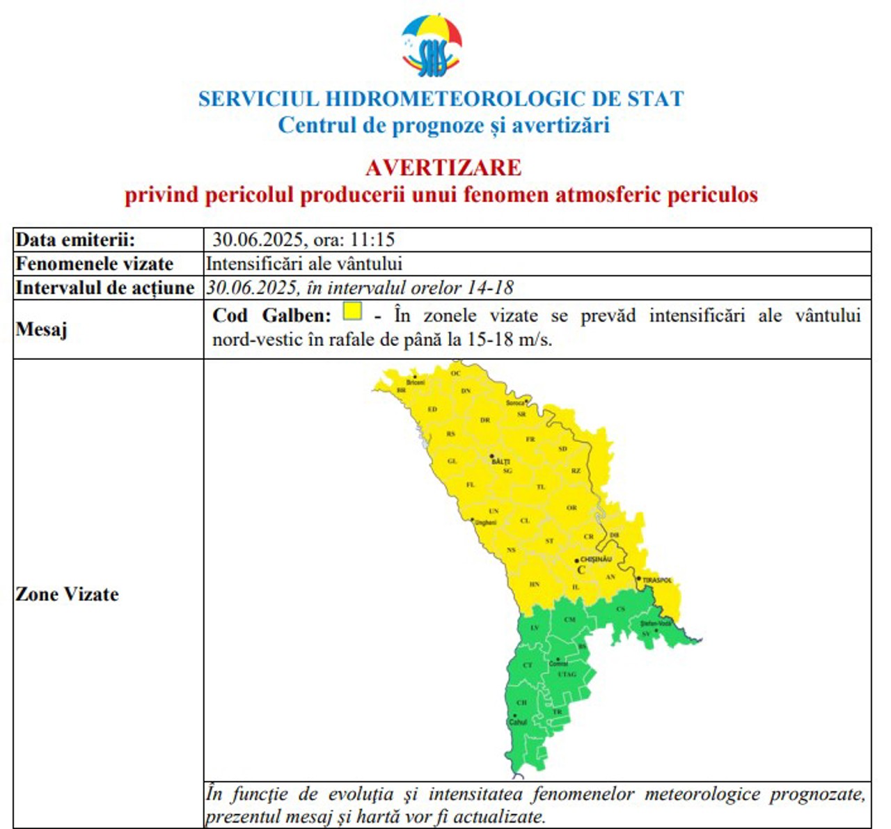 Vânt puternic în centrul și nordul R. Moldova, anunțat de meteorologi. Conform avertizării emise de Serviciul Hidrometeorologic de Stat (SHS), Codul galben de intensificări ale vântului intră în vigoare astăzi, 30 iunie, de la ora 14:00, și va fi valabil până în seara zilei de luni, la ora 18:00.
