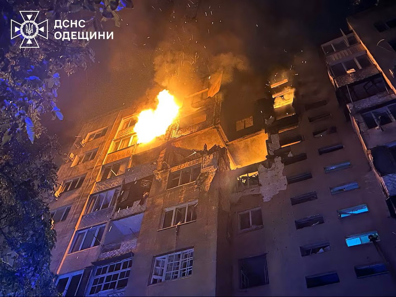 Serviciul de Stat pentru Situații de Urgență al Ucrainei a publicat imagini dramatice cu salvatori care scot copii în toiul nopții din blocul cuprins de flăcări și cu pompieri intervenind pentru stingerea incendiului.