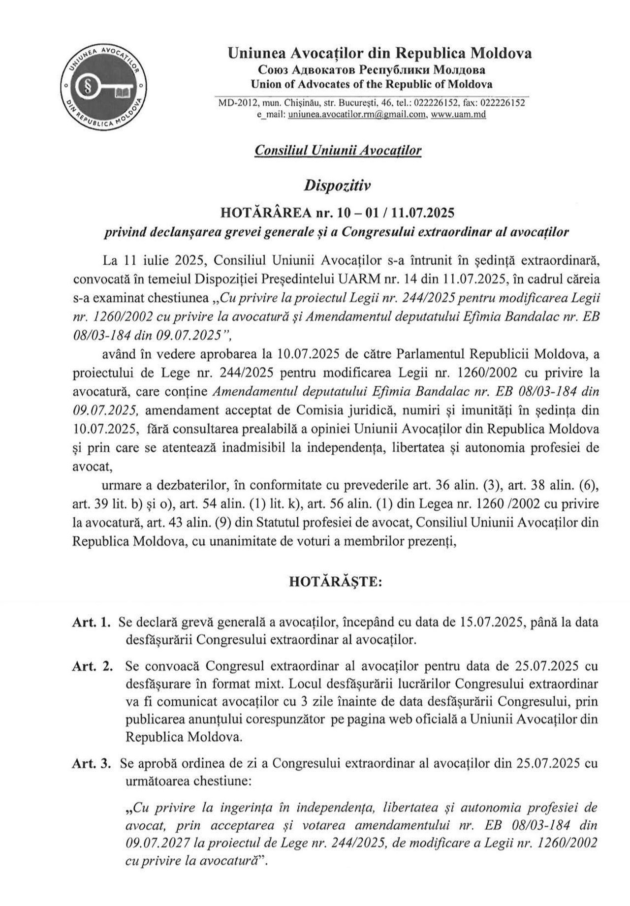 Союз адвокатов Республики Молдова (UARM) объявил о проведении всеобщей забастовки сроком на десять дней. начиная с 15 июля. Причиной стало принятие парламентом поправок к законодательству, которые, по словам председателя Союза Дорина Попеску, представляют собой «беспрецедентную атаку на независимость и автономию профессии адвоката».