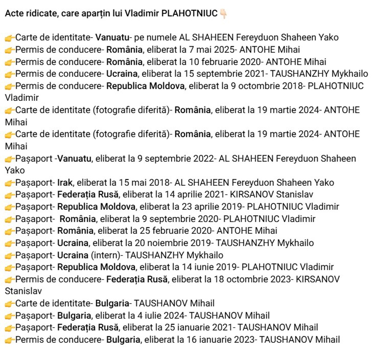 После задержания Владимира Плахотнюка в Греции у него обнаружили больше 20 документов, в том числе водительские права и загранпаспорта. Молдавская полиция опубликовала их список, опираясь на данные, полученные от греческих властей.