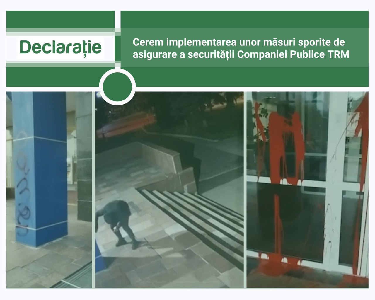 Amintim că, în noaptea de 27 iulie, sediul Companiei „Teleradio-Moldova” a fost din nou vandalizat. Persoane necunoscute au stropit cu vopsea roșie și neagră coloanele și geamurile Casei Radio, sediul administrativ al instituției. Conducerea companiei condamnă actul de vandalism și califică această acțiune drept o tentativă de intimidare a jurnaliștilor de la posturile publice de radio și televiziune.