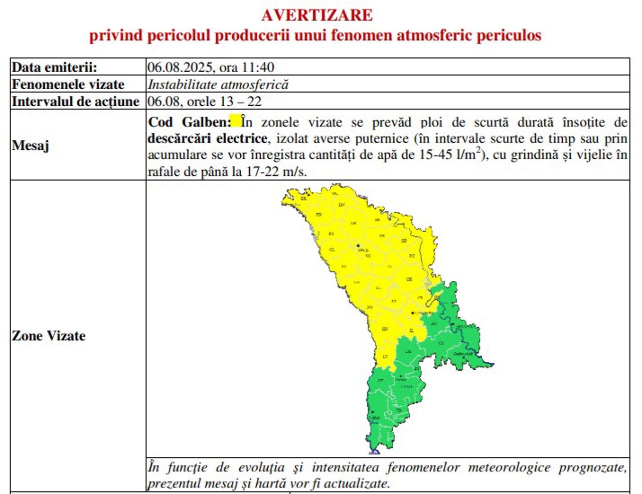 The warning is in effect for the northern and central regions of the Republic of Moldova. Heavy rainfall, lightning, hail, and storms with gusts of wind reaching up to 22 meters per second are expected until 10:00 p.m.