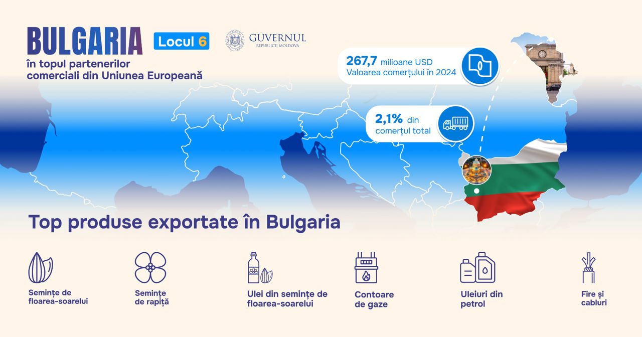 Menționăm că Bulgaria este al șaselea cel mai important partener economic al Republicii Moldova din Uniunea Europeană.