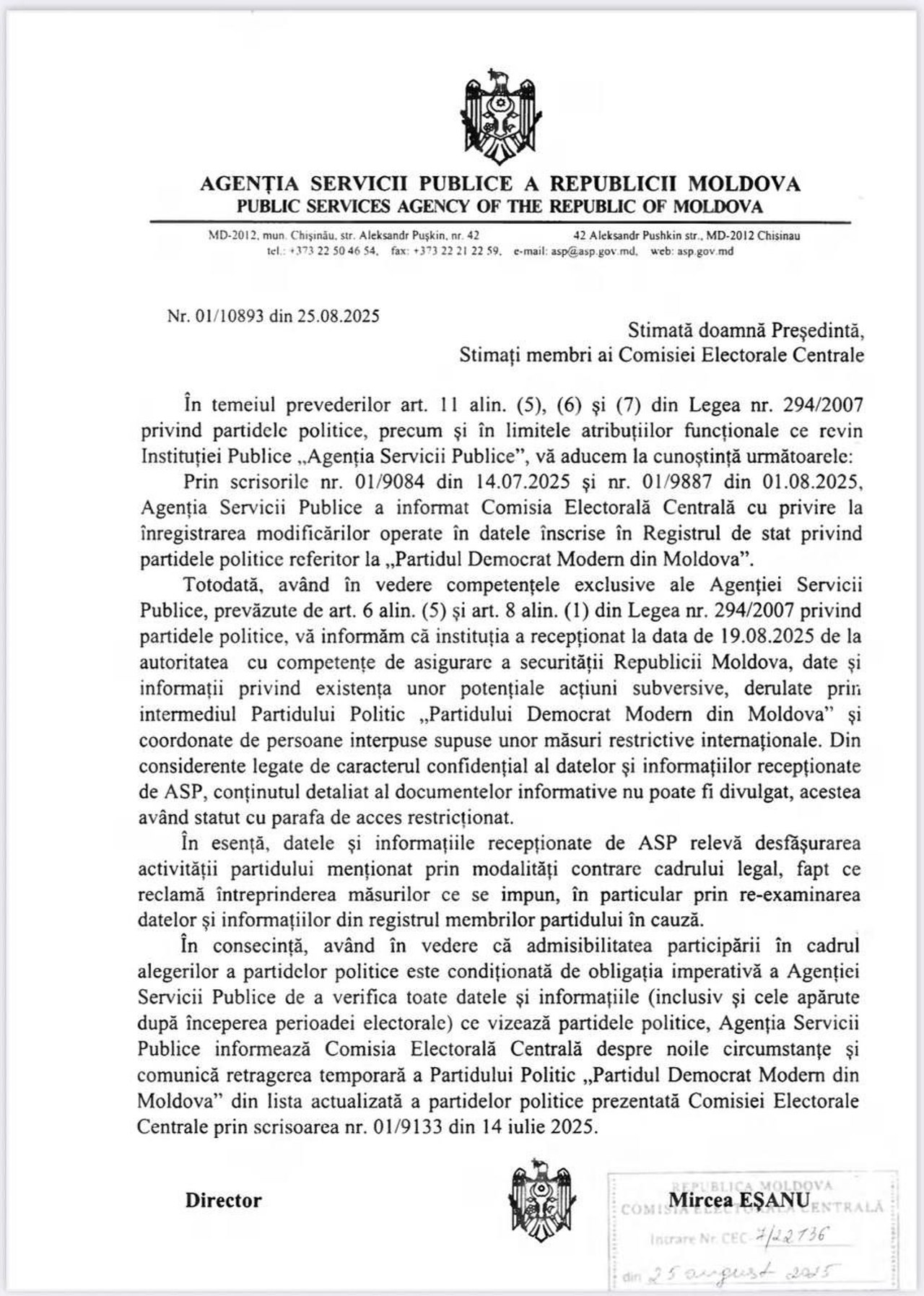 „ASP a recepționat, pe 19 august 2025, de la autoritatea cu competențe de asigurare a securității Republicii Moldova, date și informații privind existența unor potențiale acțiuni subversive, derulate prin intermediul Partidului Politic ‘Partidul Democrat Modern din Moldova’ și coordonate de persoane interpuse supuse unor măsuri restrictive internaționale”, se arată în scrisoarea semnată de Mircea Eșanu către CEC.