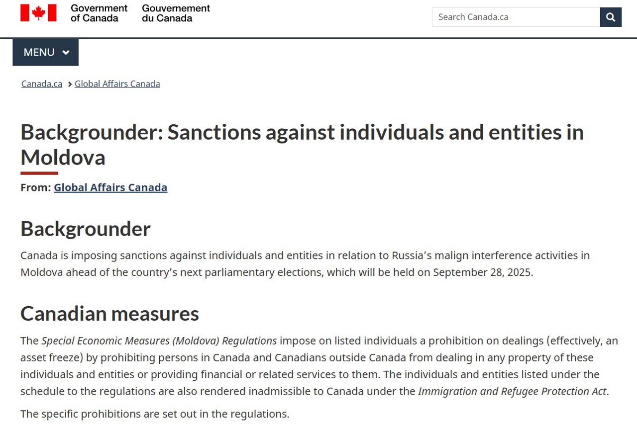 Canada a impus noi sancțiuni împotriva a 16 cetățeni moldoveni și a două entități „în legătură cu activitățile de interferență malignă ale Rusiei în Moldova înaintea următoarelor alegeri parlamentare din țară”, care vor avea loc pe 28 septembrie 2025. Persoanele vizate de sancțiuni sunt afiliate condamnatului fugar Ilan Șor.