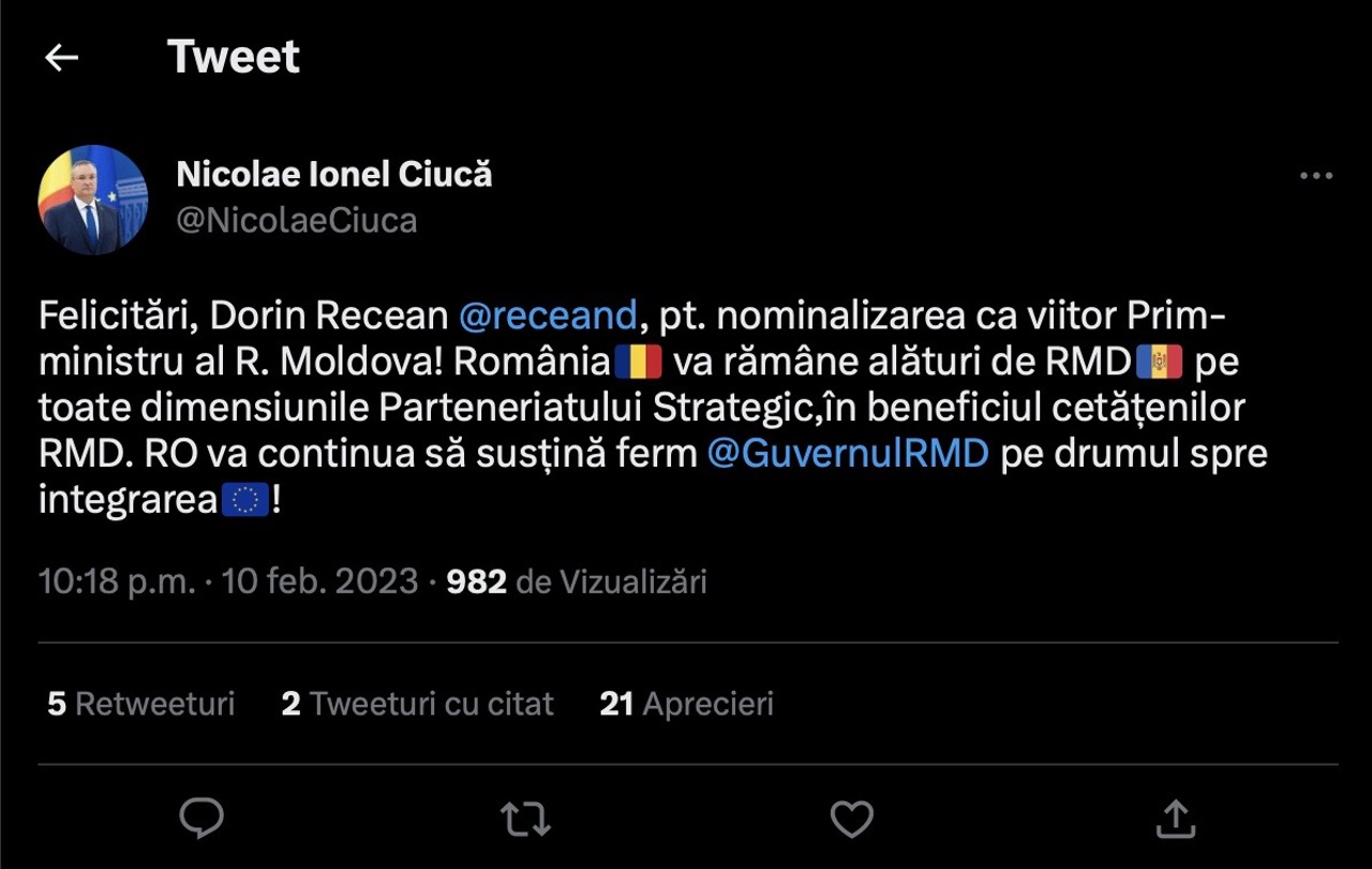 „România va rămâne alături de Republica Moldova pe toate dimensiunile Parteneriatului Strategic, în beneficiul cetățenilor Republicii Moldova. România va continua să susțină ferm Guvernul Republicii Moldova pe drumul spre integrarea în Uniunea Europeană”, se arată într-un mesaj transmis de Nicolae Ciucă pe Twitter.