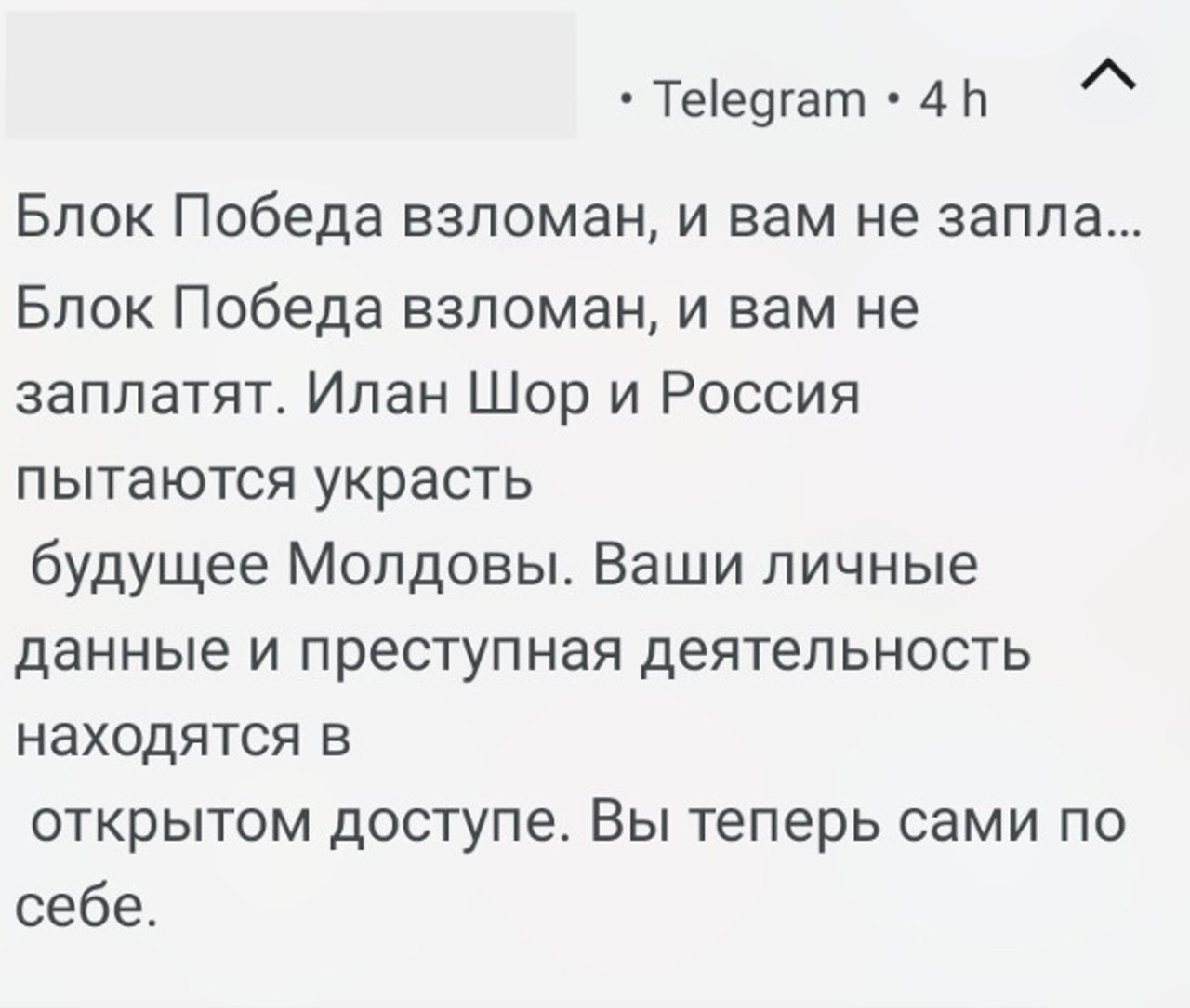 Additionally, a unique message appeared today on several Telegram channels associated with the Shor group: "The Victorie Bloc was broken, and you will no longer be paid. Ilan Shor and Russia are attempting to steal the future of the Republic of Moldova. Your personal data and criminal activities are now public for all to see. You are on your own."