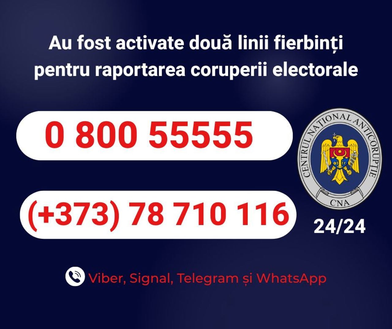 Cetățenii R. Moldova sunt îndemnați să raporteze, la două linii fierbinți, cazurile de corupere electorală, finanțare ilegală a partidelor politice, tentative de influențare ilegală a alegătorilor sau alte acțiuni suspecte în contextul electoral.