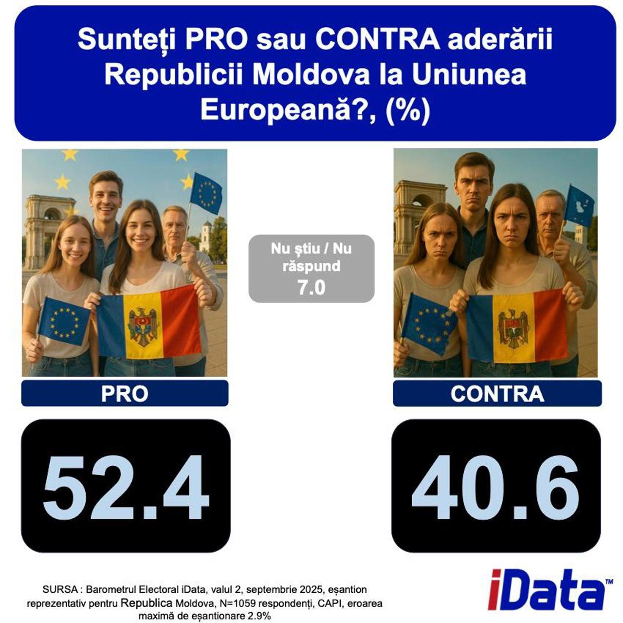 Întrebați despre parcursul european al țării, 52,1% dintre cetățeni au declarat că susțin aderarea Republicii Moldova la Uniunea Europeană, în timp ce 40,6% se opun.