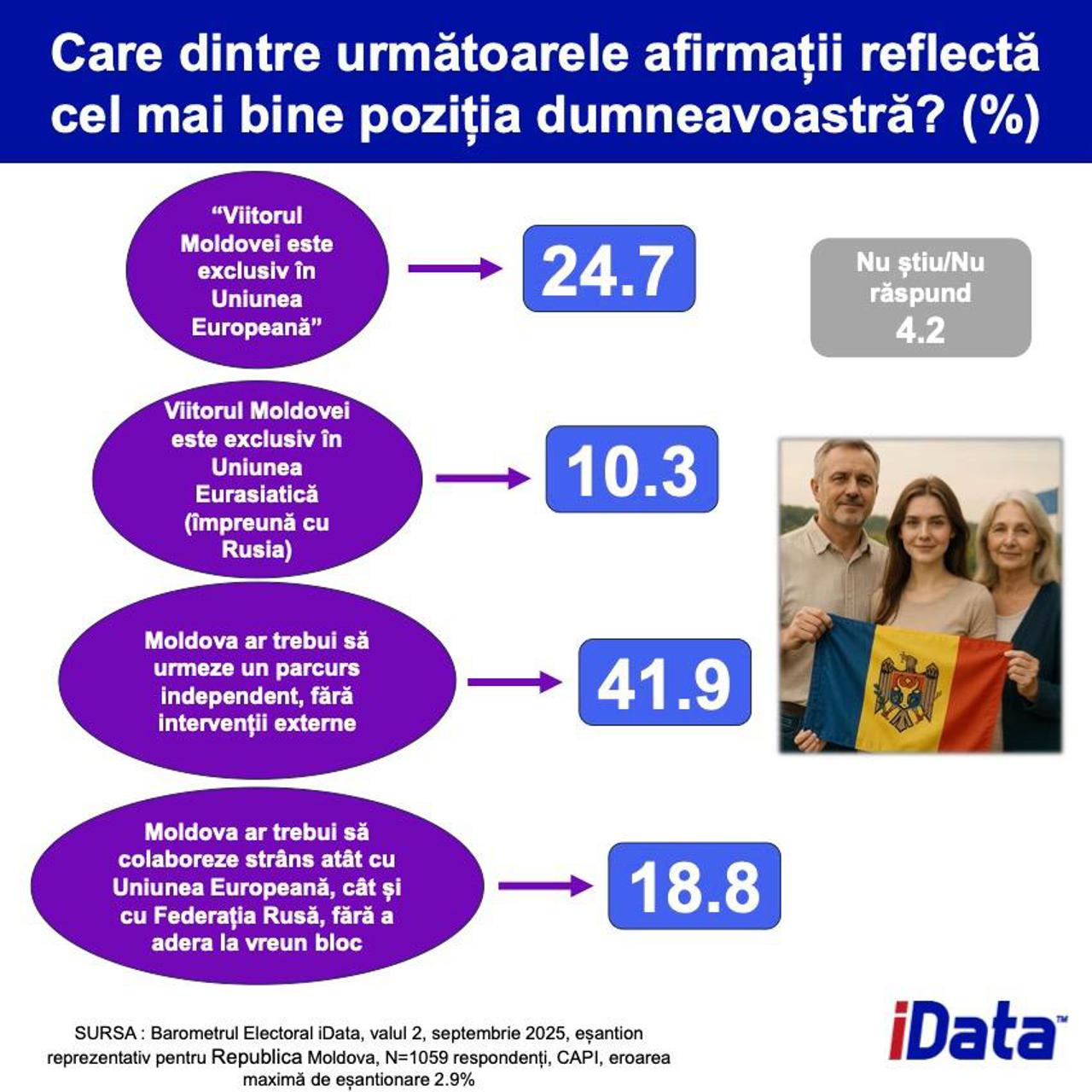 Întrebați despre calea de dezvoltare a Republicii Moldova, 24,7% consideră că viitorul statului este exclusiv în Uniunea Europeană, 10,3% văd viitorul alături de Uniunea Euroasiatică, iar 41,9% optează pentru un parcurs independent.