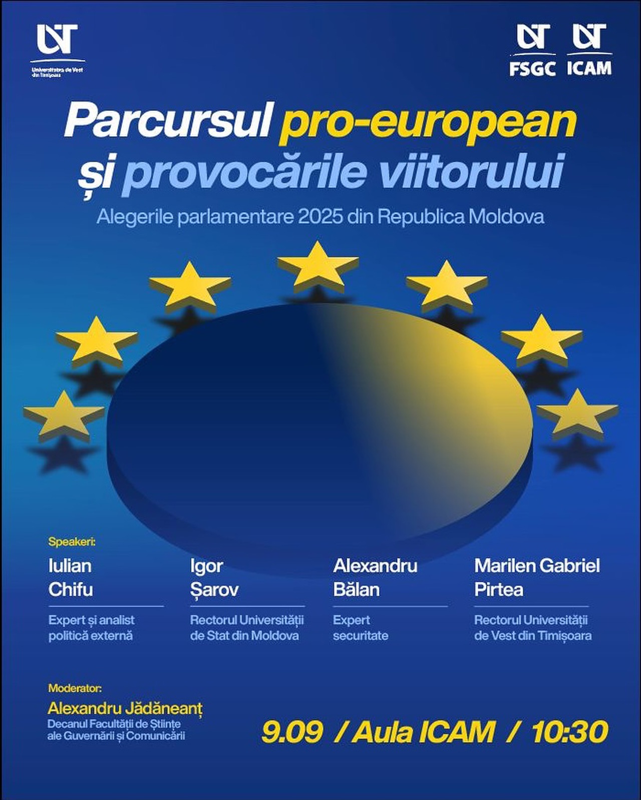 Masa rotundă cu tema „Parcursul proeuropean și provocările viitorului: alegerile parlamentare 2025 din R. Moldova” urma să se desfășoare astăzi, 9 septembrie, începând cu ora 10.30, la Universitatea de Vest din Timișoara (UVT).