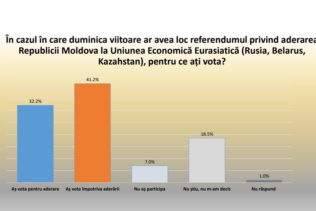 Dacă ar avea loc un referendum pentru aderarea la Uniunea Economică Eurasiatică (Rusia, Belarus, Kazahstan), 41,2% ar vota împotrivă, iar 32,2% - pentru. Alți 18,5% din intervievați sunt indeciși, iar 7% nu ar participa.
