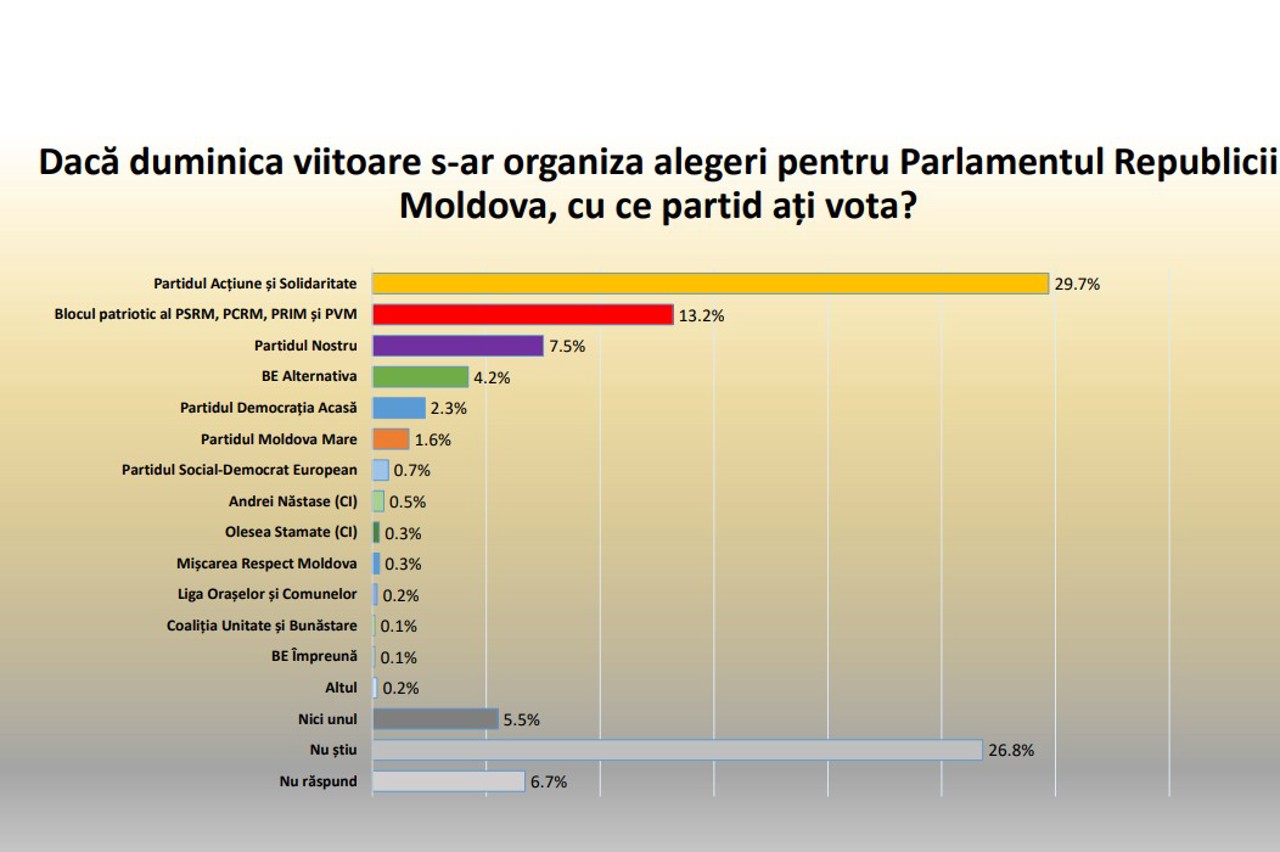 Potrivit cercetării, Partidul Acțiune și Solidaritate (PAS) ar acumula 29,7% din intențiile de vot, Blocul Electoral „Patriotic al Socialiștilor, Comuniștilor, Inima și Viitorul Moldovei” – 13,2%, iar Partidul Nostru – 7,5%.
