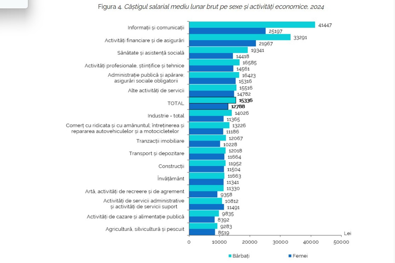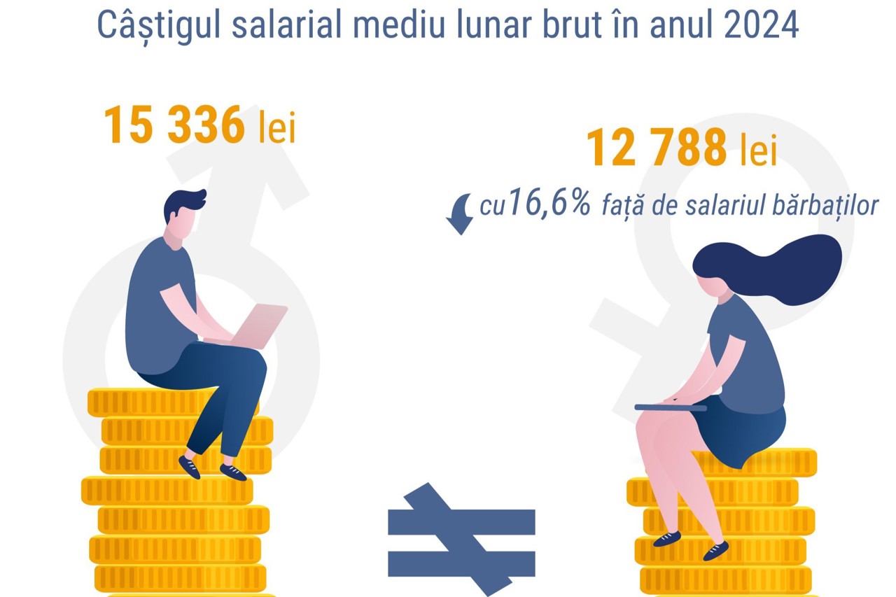 Potrivit datelor Biroului Național de Statistică, salarial mediu lunar brut al femeilor, în anul 2024, a constituit 12.787 de lei, în timp ce bărbații au primit în medie 15.335 de lei.