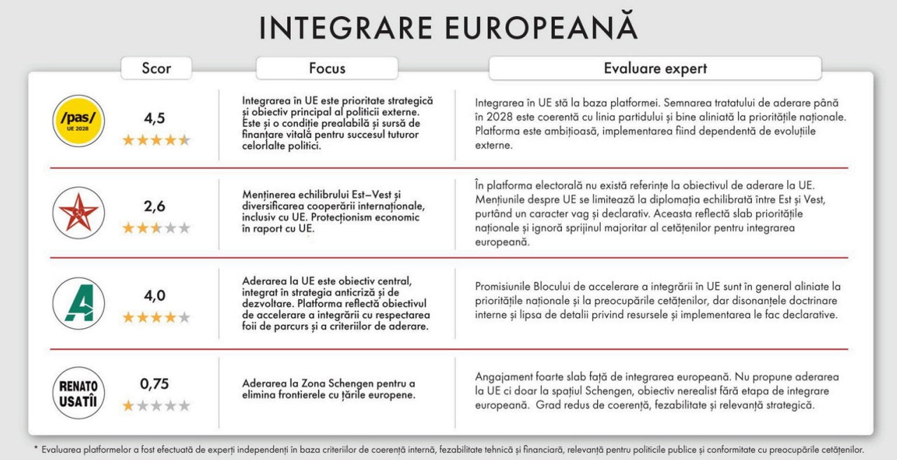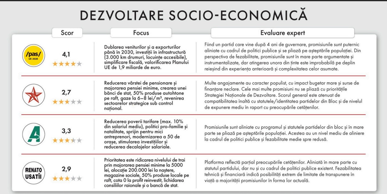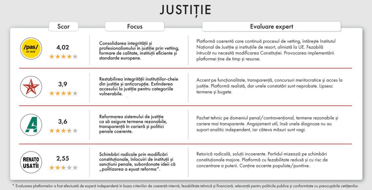 Partidele au fost punctate pe o scară de la 0 la 5, în funcție de coerența propunerilor, fezabilitatea lor, compatibilitatea cu strategiile naționale și relevanța pentru prioritățile cetățenilor.