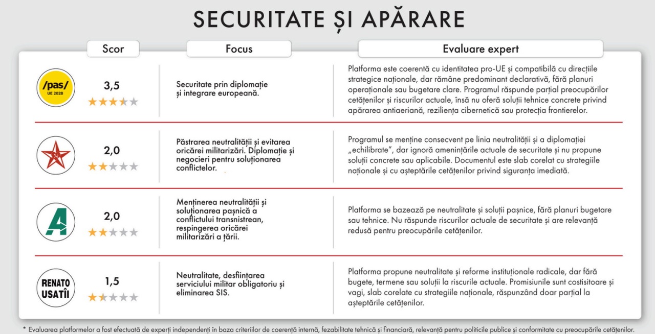 Doar una dintre formațiuni leagă securitatea Republicii Moldova de integrarea europeană, în timp ce celelalte se limitează la reafirmarea neutralității, demilitarizare și soluționarea pașnică a conflictului transnistrean. Politicienii vorbesc despre război în discursuri, dar nu și în programele electorale.