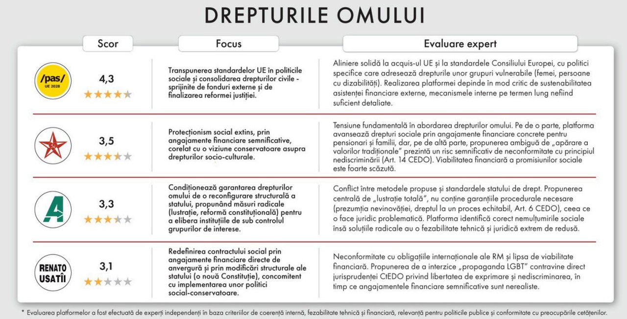 Precizăm că documentul intitulat „Analiza comparativă a platformelor electorale” a fost elaborat de Asociația pentru Democrație Participativă (ADEPT) împreună cu cinci experți independenți, susținut de Fundația Soros Moldova, și a fost prezentat public pe 24 septembrie, la un club de presă.