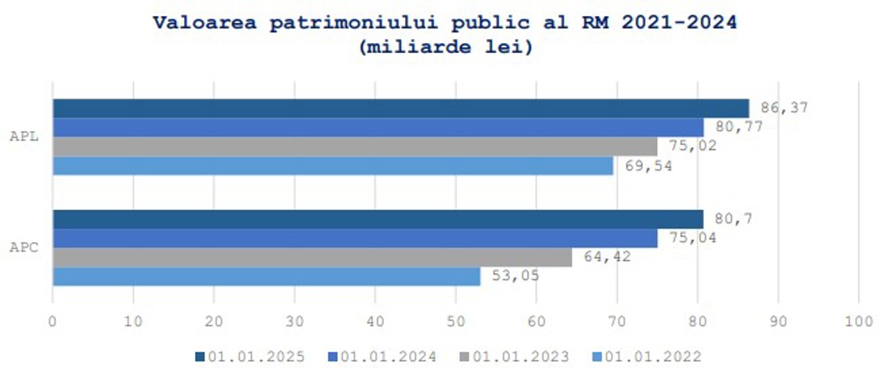Valoarea totală a patrimoniului public al Republicii Moldova însuma 167,07 miliarde de lei la începutul anului 2025, fiind administrat în proporții aproape egale de autoritățile publice locale și cele centrale. Față de anul precedent, valoarea patrimoniului a crescut cu 11.26 de miliarde de lei sau cu 6.74%, potrivit datelor Registrului patrimoniului public gestionat de Agenția Proprietății Publice (APP).
