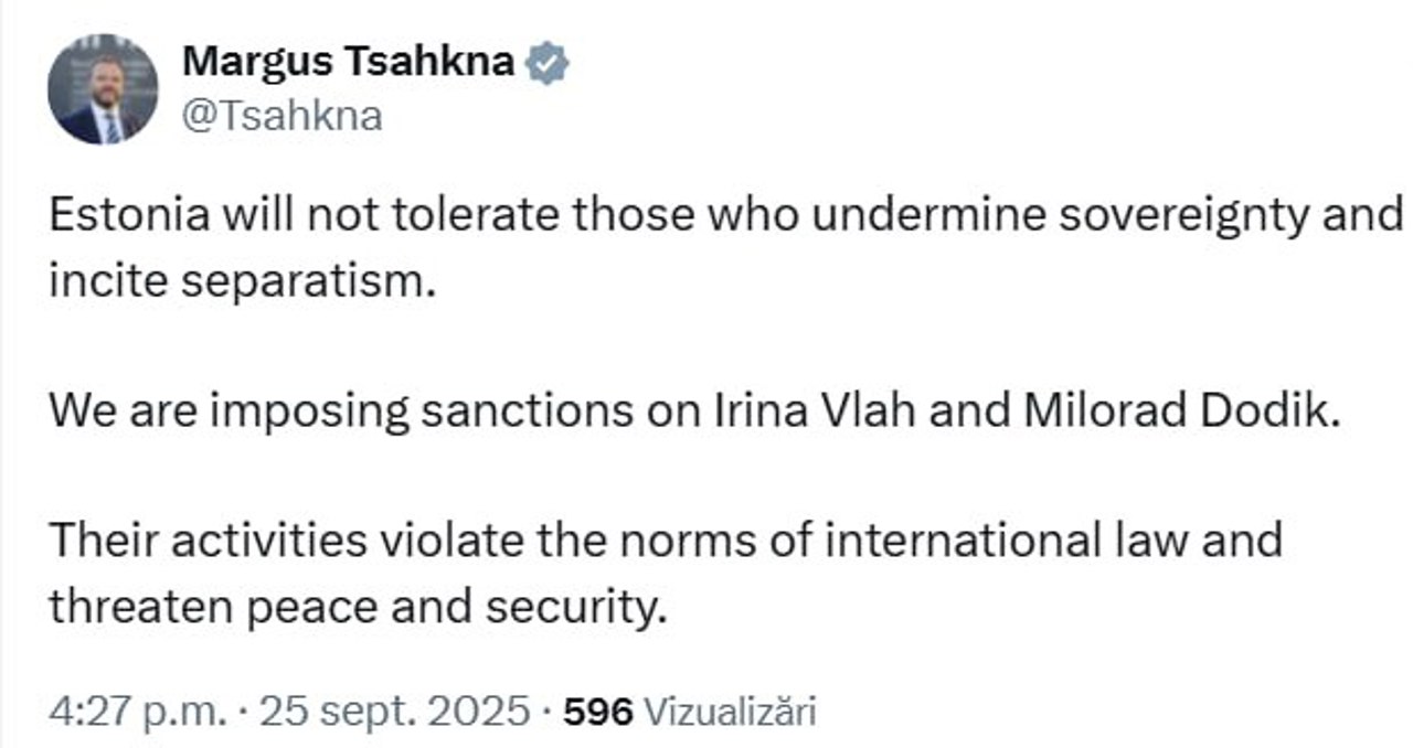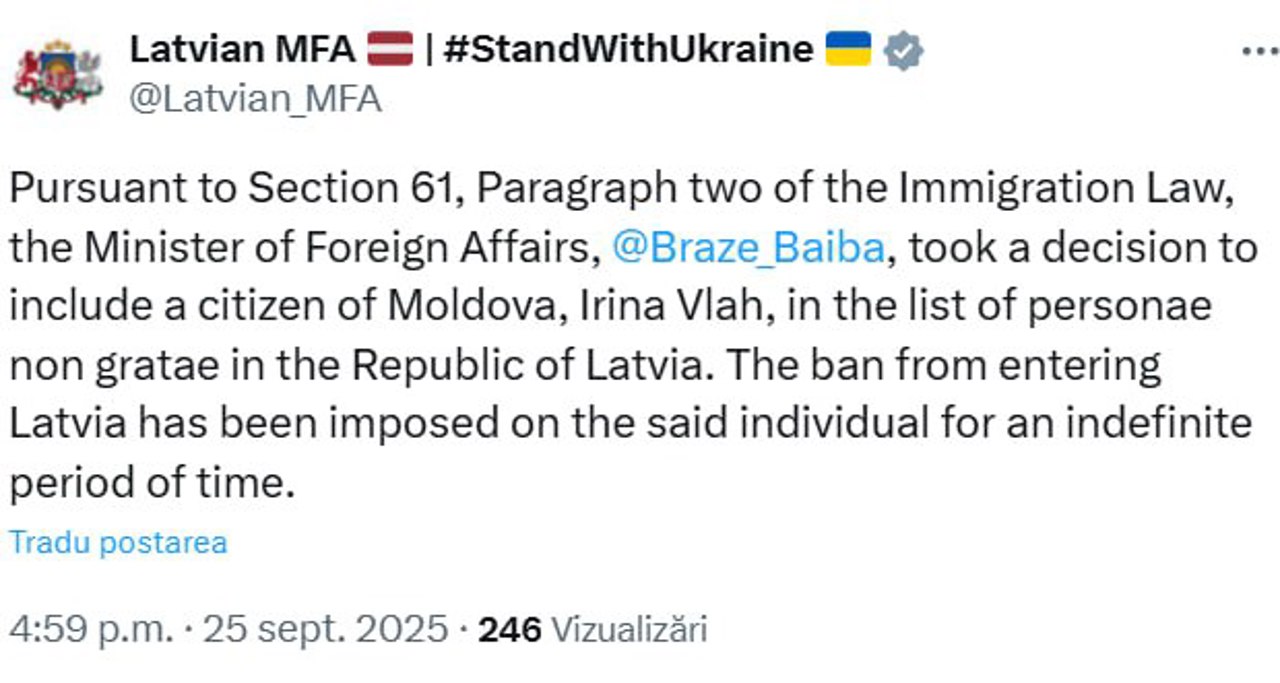 Ministerul lituanian al Afacerilor Externe (MAE) a anunțat pe 16 septembrie că i-a aplicat Irinei Vlah interdicție de intrare pe teritoriul Lituaniei pe o perioadă de cinci ani.