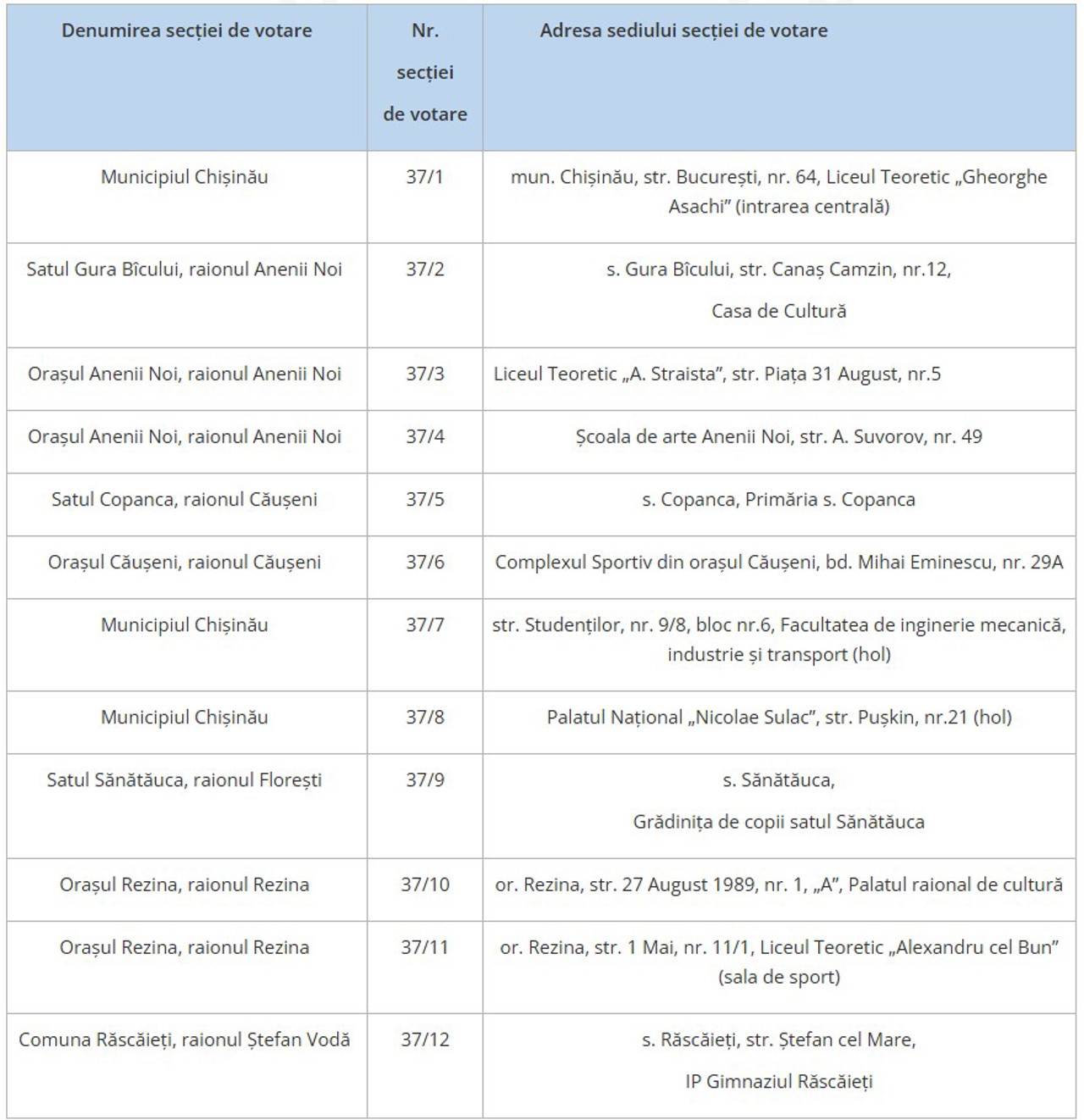 Comisia Electorală Centrală a publicat adresele secțiilor de votare realocate pentru alegătorii localităților din stânga Nistrului. Adresele au fost modificate în urma unei sesizări despre existența unor riscuri majore la adresa securității, inclusiv posibile alerte cu bombă și provocări în ziua votării.