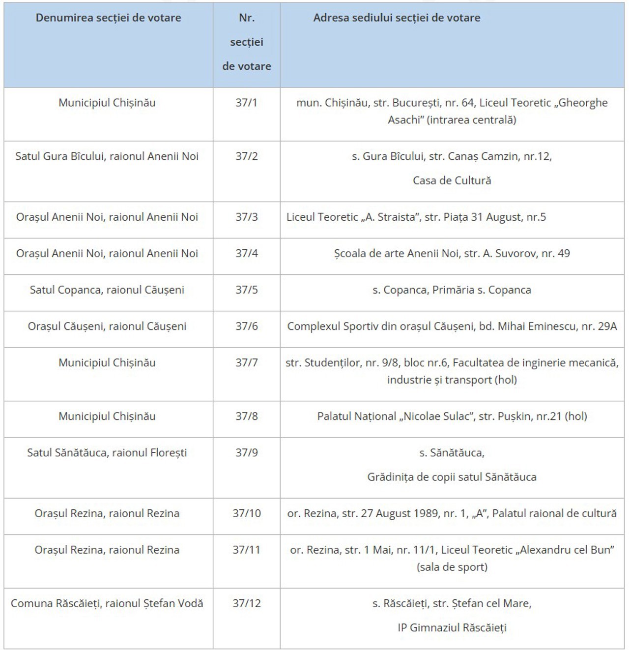 Comisia Electorală Centrală a publicat vineri adresele secțiilor de votare realocate pentru alegătorii localităților din stânga Nistrului. Adresele au fost modificate în urma unei sesizări despre existența unor riscuri majore la adresa securității, inclusiv posibile alerte cu bombă și provocări în ziua votării.