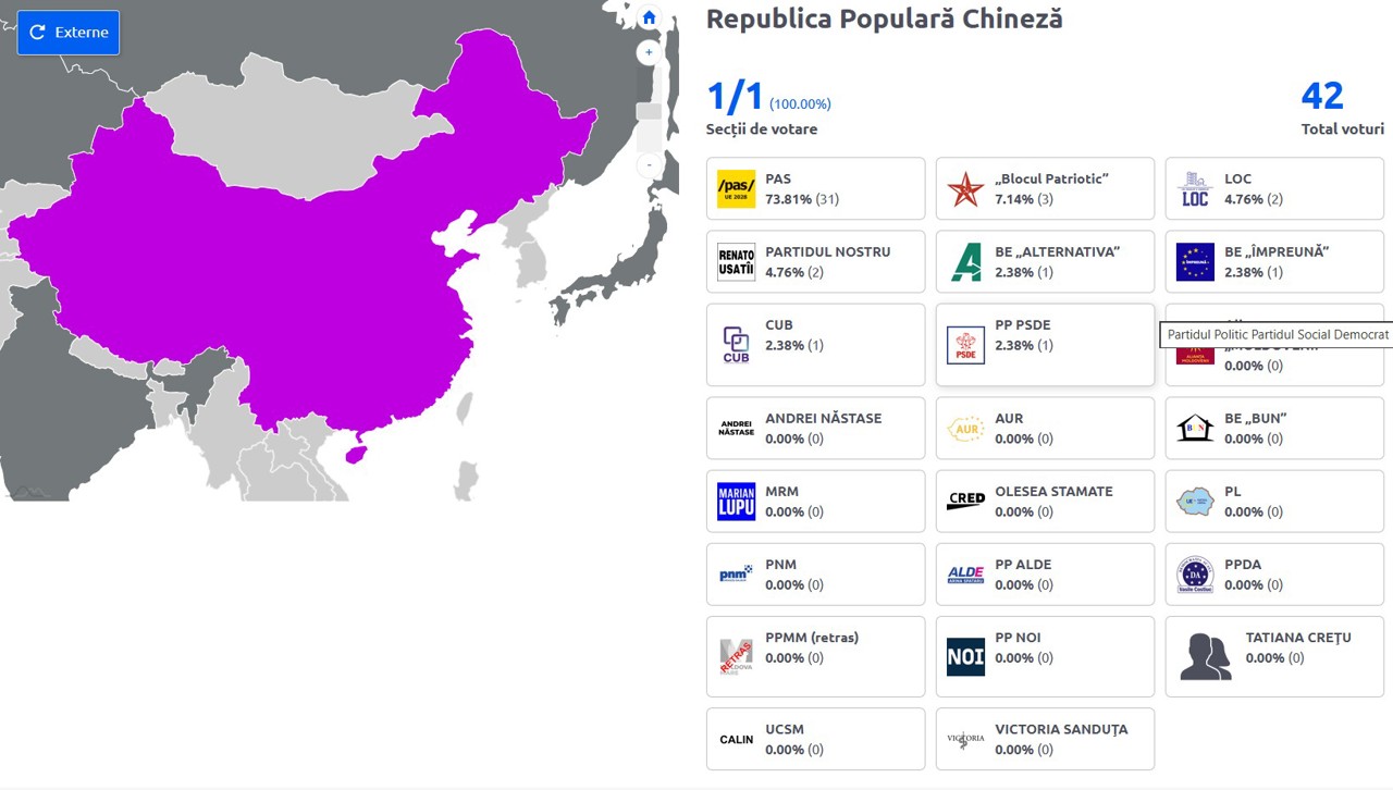 În China, PAS a acumulat 73,81% din totalul celor 42 de voturi exprimate, fiind urmat de BEP cu 7,14%, iar Liga Orașelor și Comunelor și Partidul Nostru - cu câte 4,46%.