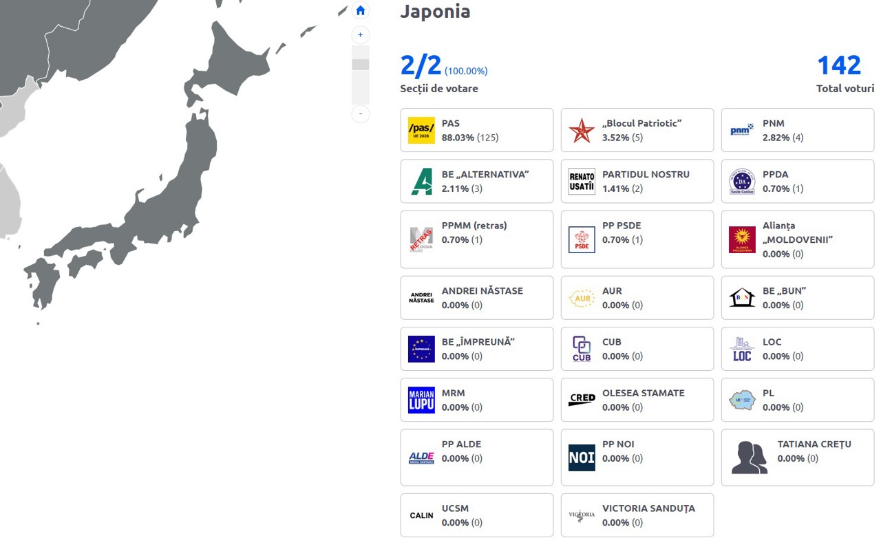 În Japonia, dintre cei 142 de alegători care s-au prezentat la urne, PAS a obținut 88,03% din voturi, în timp ce Blocul Electoral „Patriotic” (BEP) a adunat 3,52%.