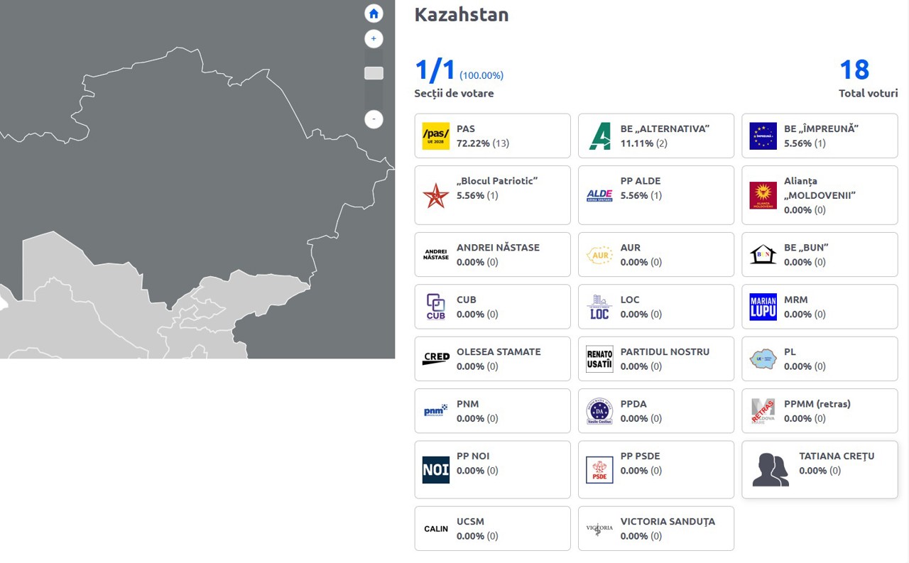 Rezultate similare au fost înregistrate și în Kazahstan, unde PAS a acumulat 72,22% din totalul celor 18 voturi, Blocul „Alternativa” - 11,11%.