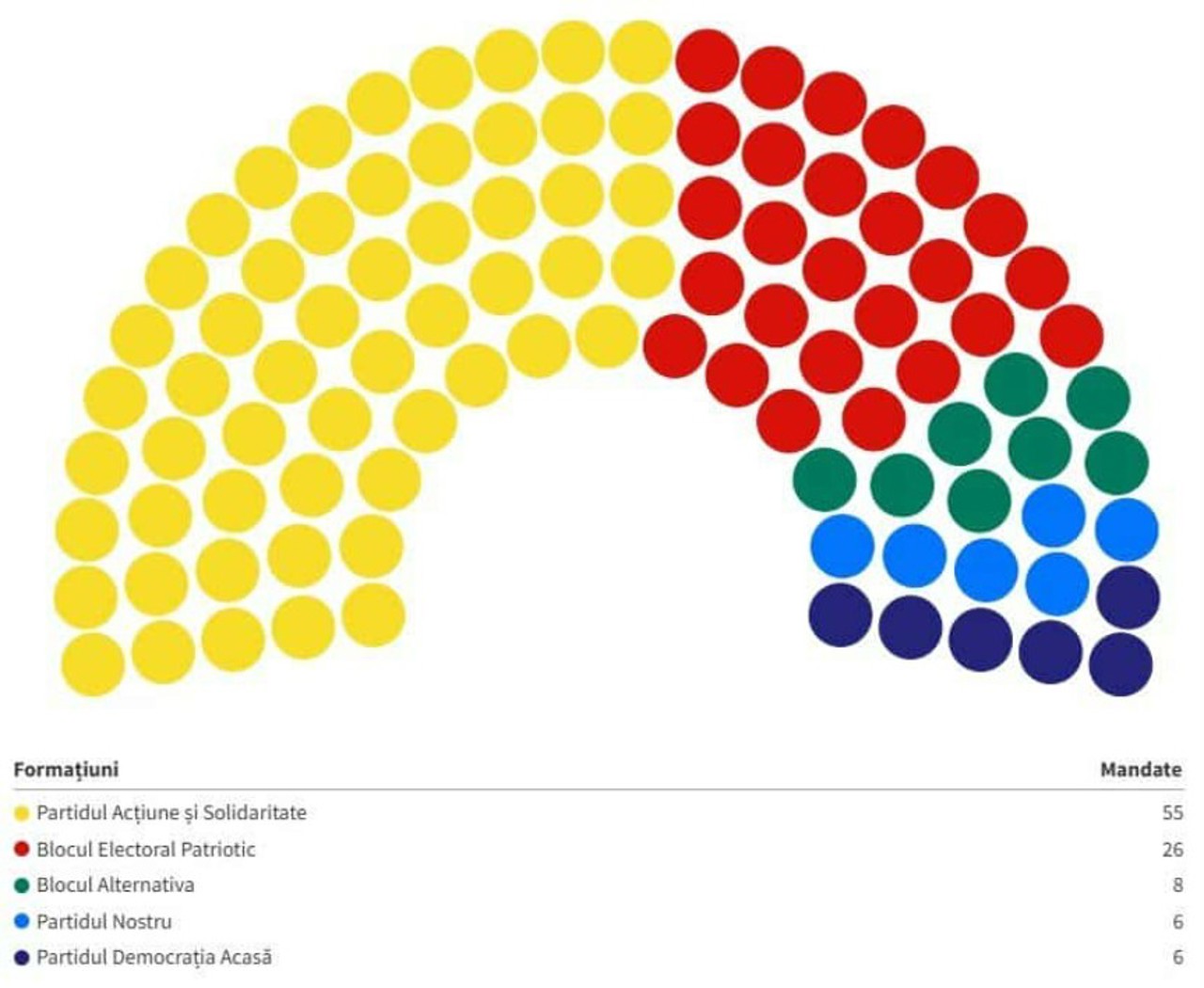 Totodată, Blocul „Patriotic” ar putea deține 26 de mandate în următorul Legisltiv, Blocul „Alternativa” – opt mandate, Partidul Nostru și Partidul „Democrația Acasă” – câte șase mandate.