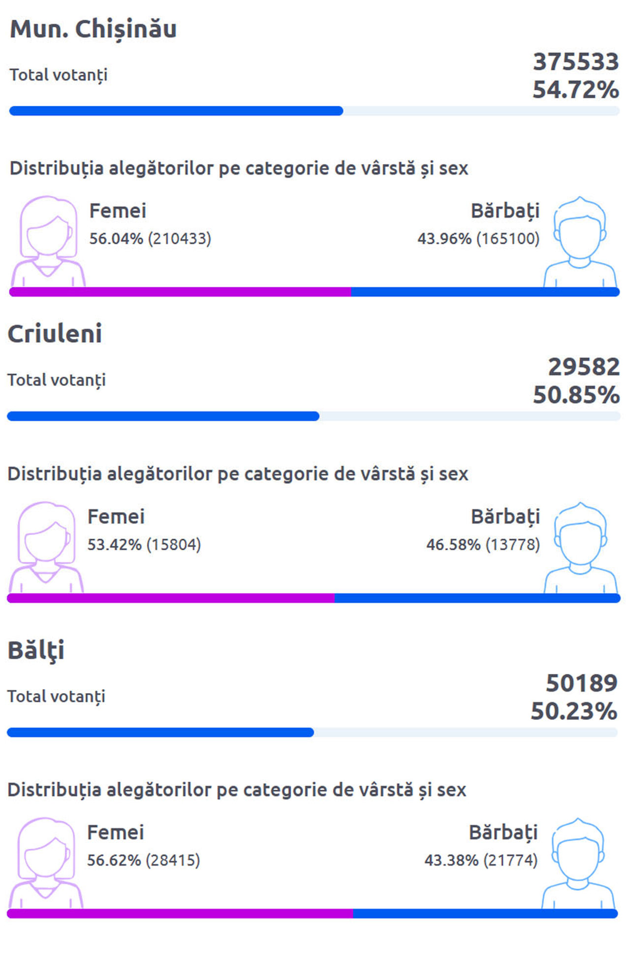 Chisinau ranked first in terms of voter turnout, with 375,533 voters or 54.72% of those registered on the electoral lists.