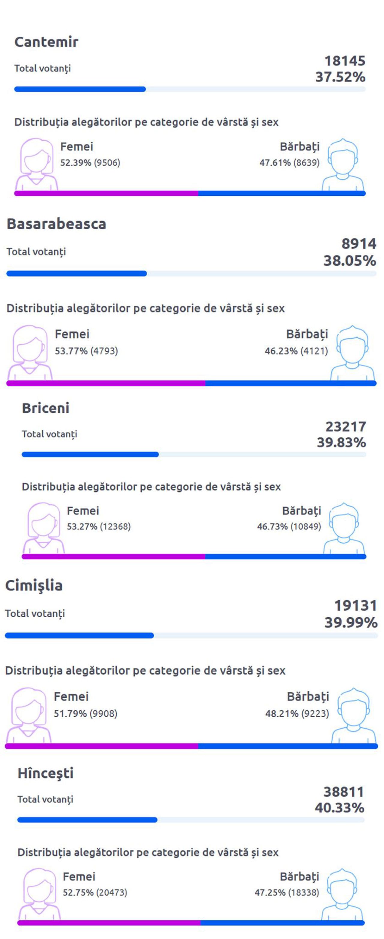 In Cantemir, 18,145 people voted on Sunday, in Basarabeasca - 8,914, in Cimișlia - 19,131, and in Hâncești - 38,881 voters.
