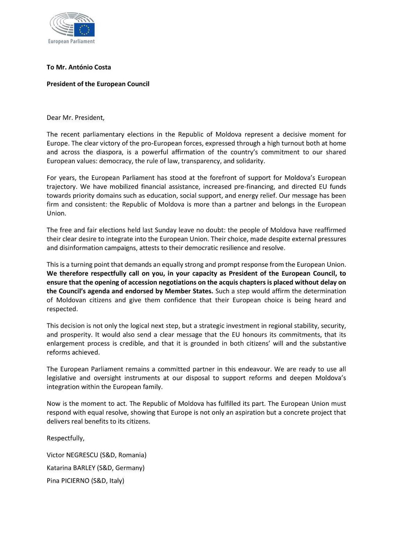 Fifty-five Members of the European Parliament (MEPs) from 19 EU member states have signed a letter to the President of the European Council, António Costa, urging the “immediate opening” of accession negotiations with the Republic of Moldova. This announcement was made by Victor Negrescu, Vice-President of the European Parliament, who initiated this action.