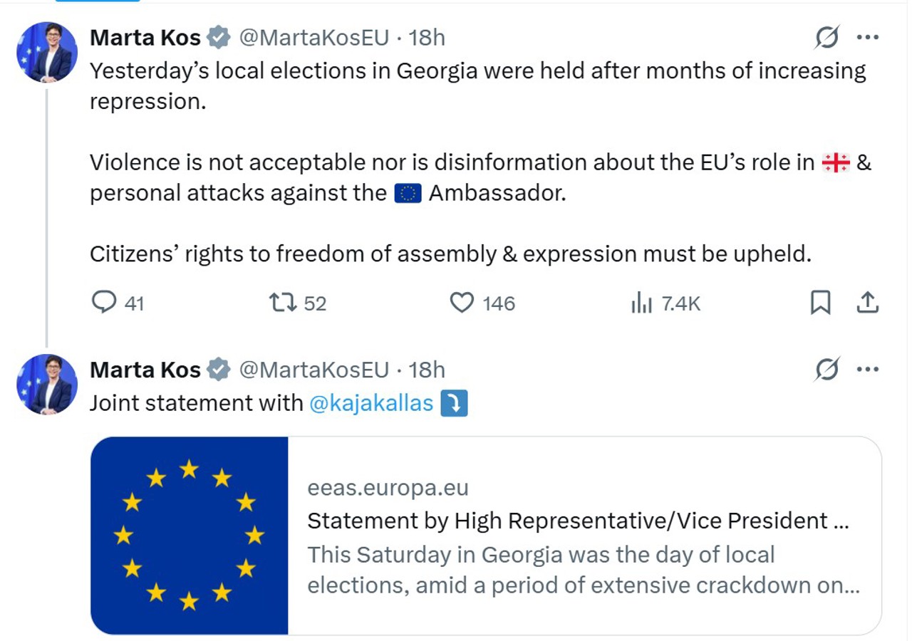 The EU harshly criticised the local elections held in Georgia, stating that the vote took place "amidst a period of widespread repression of those who disagree" with the government, according to DPA.