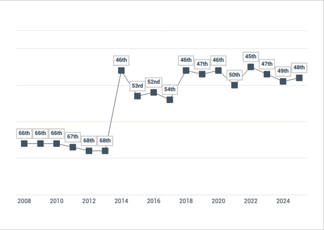 In the following years, the Republic of Moldova maintained a stable position in the first half of the ranking, achieving its best result in 2022, when it ranked 45th worldwide.