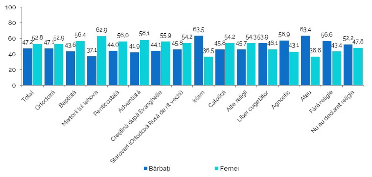 Pe criteriu de gen, femeile predomină în majoritatea confesiunilor, cea mai mare pondere fiind înregistrată la Martorii lui Iehova - 62.9%. În schimb, bărbații sunt majoritari în rândul musulmanilor - 63.5% și al celor neafiliați religios, în special atei - 63.4% și agnostici - 56.9%.