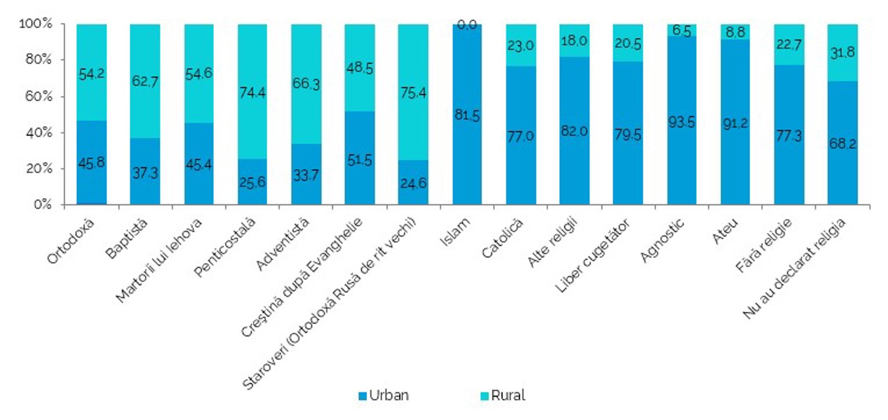 Distribuția geografică a apartenenței religioase confirmă un contrast clar între mediul rural și cel urban. În mediul rural predomină ortodocșii - 54.2%, precum și baptiștii, penticostalii, adventiștii și staroverii, confesiuni cu rădăcini profunde în comunitățile tradiționale.